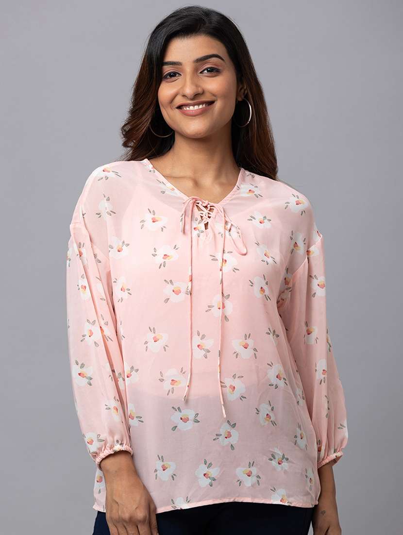 Women pink loose fit top has floral print, tie-up V-neck, long puff sleeves and regular length.
