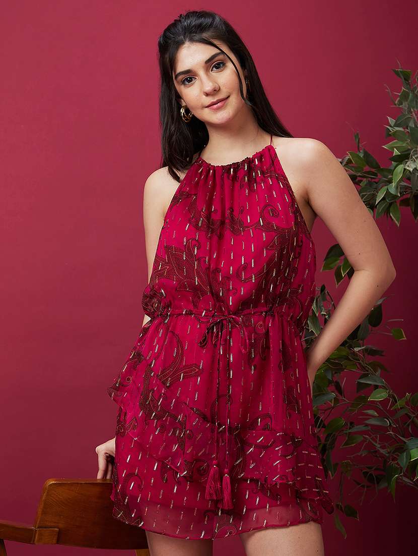 Elevate your party look with the Pink Halter Neck Sleeveless Dress. Featuring a fit-and-flare silhouette and an above-knee length, this printed dress offers a stylish and comfortable option for special occasions. The lurex printed blouson adds a touch of glamour to the ensemble.