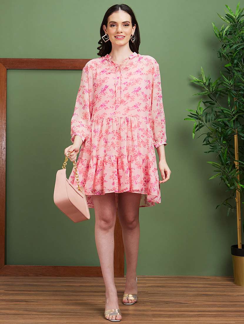 Embrace the charm of this pink floral print mandarin collar A-line dress by Globus. The woven fabric and A-line silhouette create a comfortable and stylish fit. The knee-length dress features three-quarter sleeves, adding a touch of elegance to your casual wardrobe.