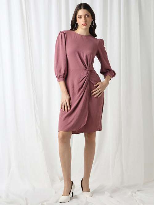 Upgrade your work wardrobe with this pink sheath dress featuring puff sleeves and a twisted front detail. The self-design texture adds depth, while the round neck keeps it refined. Finished with a back zip, it blends sophistication with modern flair. Perfect for office to evening plans.