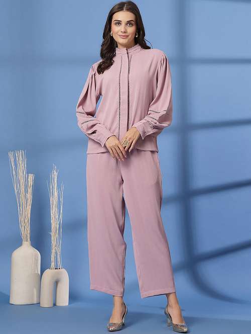 pink polyester shirt and trouser set coord