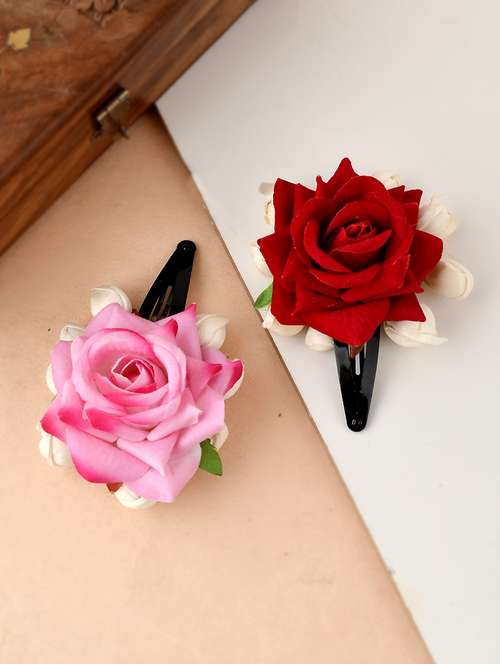 - » set of 2 red & pink artificial rose flower tic tac hair clip