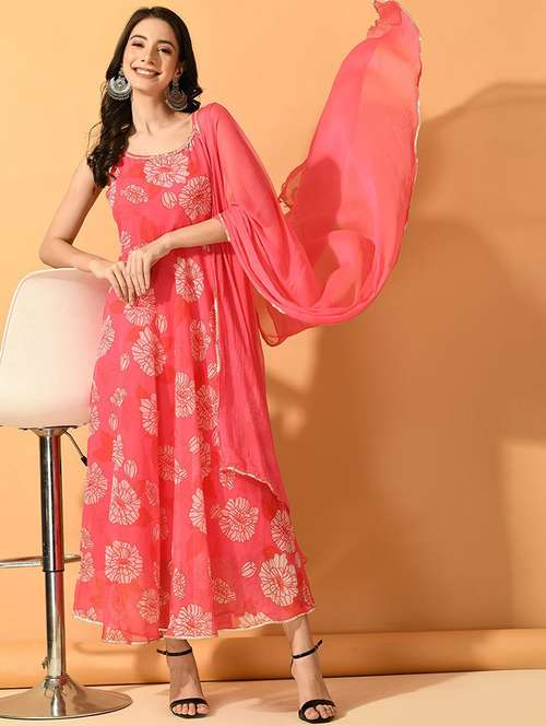 • Find gorgeous sets of ethnic wears in trending designs in coral colors suitable for casual wear of occasions.