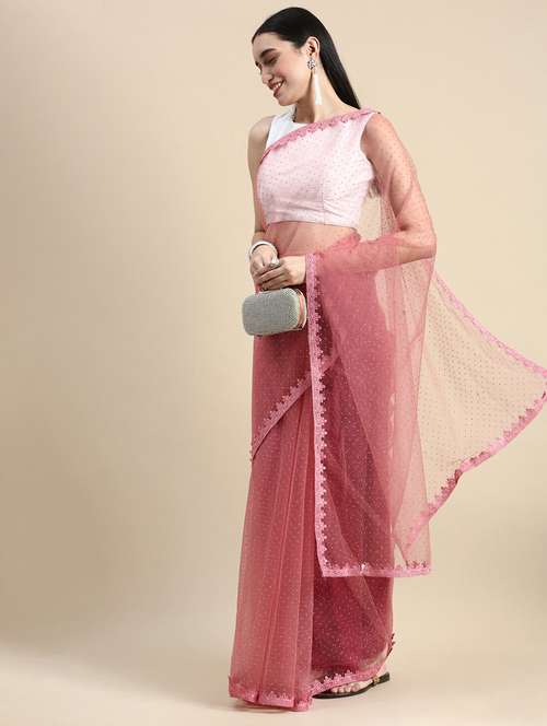 Kasee Embellished Net Saree With Embroidered Bordered Designed for the modern woman who loves traditional charm, this saree features intricate embroidery along the border, adorned with delicate beads and sparkling stone details. The soft pink hue adds a touch of femininity and sophistication, making it ideal for festive occasions, weddings, or special celebrations. The embellishments catch the light beautifully, adding just the right amount of shimmer to your look.