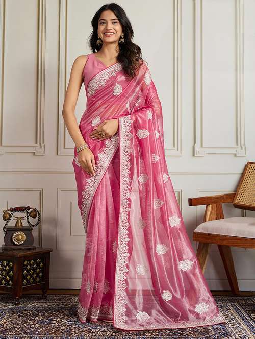 This stylish Pink twill net saree is adorned with intricate floral thread cording and delicate sequin embroidery, making it a perfect choice for special occasions. Crafted from premium twill net, it offers a soft, breathable texture and drapes gracefully for comfortable all-day wear. The saree comes with an unstitched mono banglory blouse piece enhanced with matching sequin embroidery, allowing you to create a personalized and elegant fit.