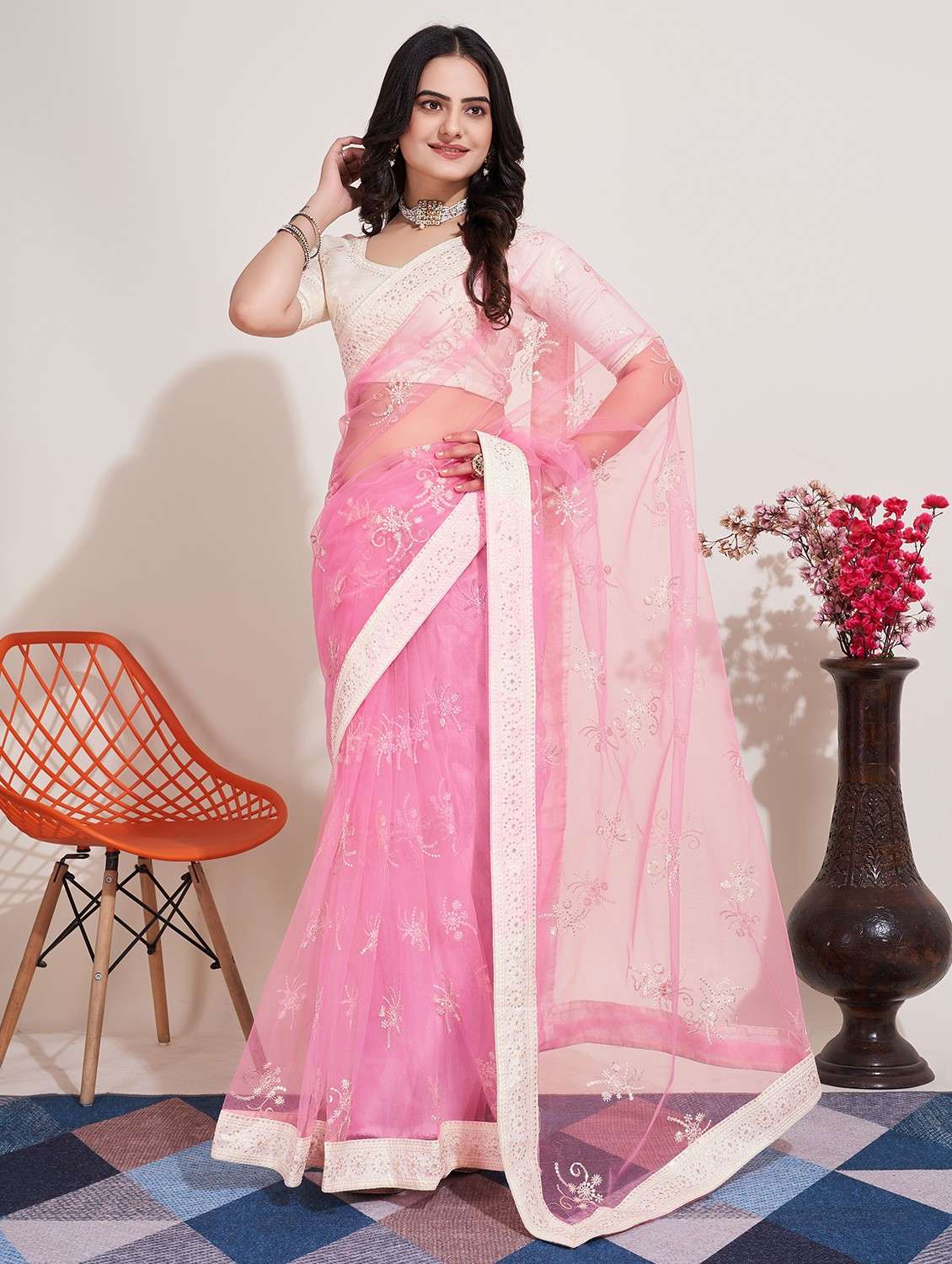 - » pink net embroidered saree with blouse