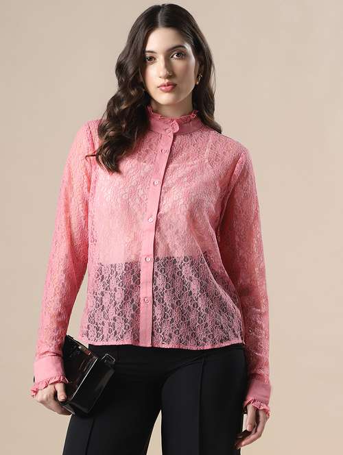 globus women pink frilled neck cuffed sleeves curved hem floral lace party shirt
