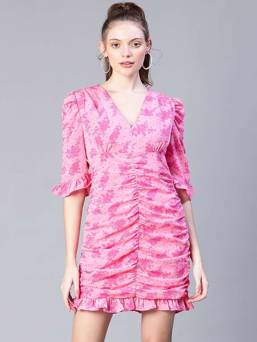 Step into a world of floral enchantment with this Season's pink floral print gather pleated ruffle women's dress adorned with a captivating floral print. The V-neckline adds a touch of allure, while the gathered pleats on the bodice create a flattering silhouette. The dress boasts delightful ruffles along the sleeves and hem and with a lining underneath, it ensures both comfort and confidence. Ideal for garden parties and springtime events, this pink dress with floral print blooms with radiant charm and elegance.