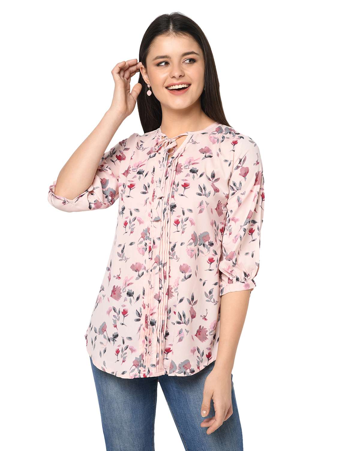 - » pink floral printed pintuck detailed regular top