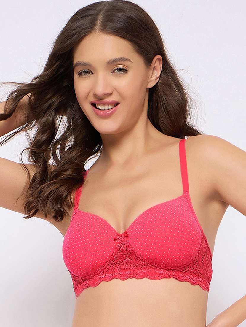 This pink bra features padded cups to ensure modesty protection. It is meticulously crafted from exquisite lace fabric below the cups, adding a touch of elegance to its design. The bra has non-wired cups, providing a comfortable and poke-free experience. Full coverage cups effectively prevent any potential top or side spillage. The double-layered cups are designed to safeguard modesty.