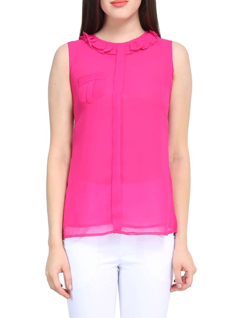 Dress up your summer sensibility when you wear this Pink coloured top by Femninora. Made from poly georgette, this regular fit top will keep you comfortable in summers. This top can be paired with basic blue coloured jeans and sneakers.