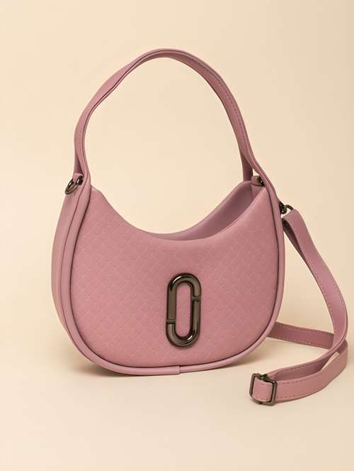 Make a bold fashion statement with this chic moon-shaped shoulder bag in a soft blush pink tone. With its unique crescent silhouette, this bag is crafted from premium textured faux leather and features a structured top handle for shoulder carry. It includes a detachable long strap for versatile styling as a crossbody sling. The spacious zip-closure compartment keeps your essentials secure, while the metallic accent on the front adds a touch of designer elegance. Perfect for brunches, dates, or street-style fashion moments.