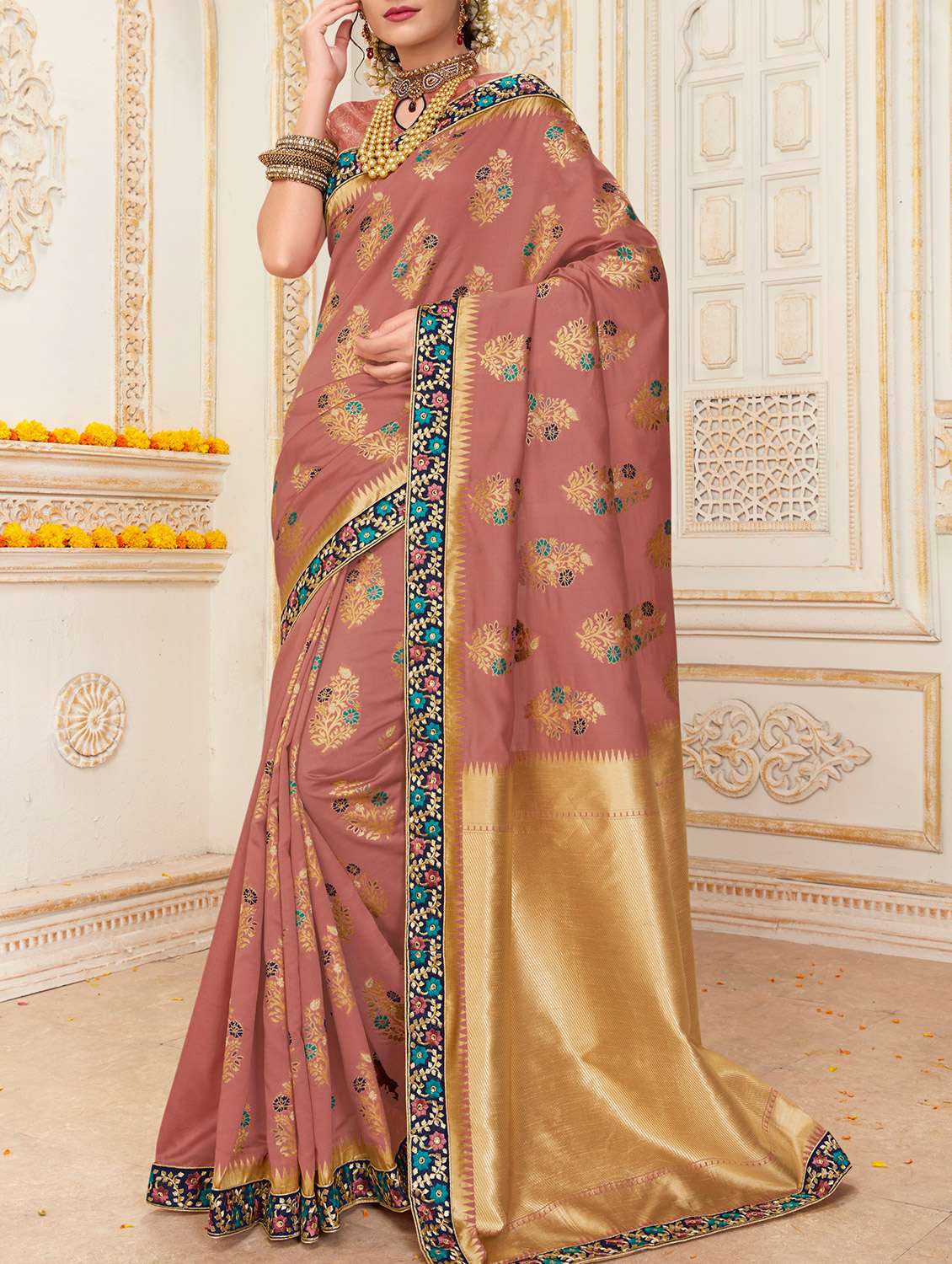 pink woven saree with blouse