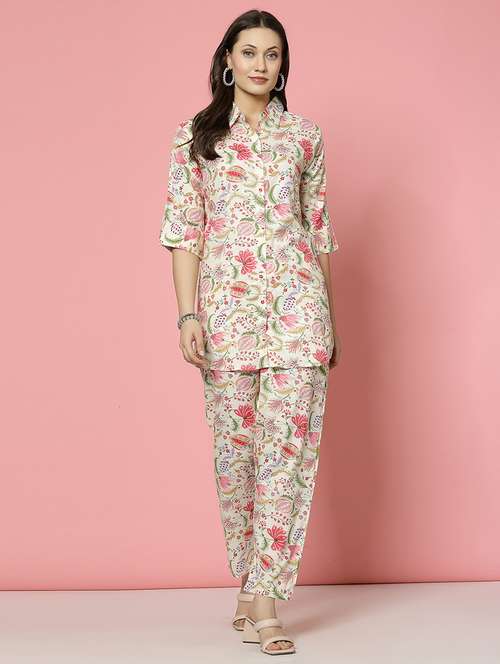 This co-ords consists of a Printed Shirt with Trousers. Pink and green floral printed shirt has three quarter sleeves, Shirt Collar and button closure. Pink and green floral printed trousers has elasticated waistband and slip-on closure.