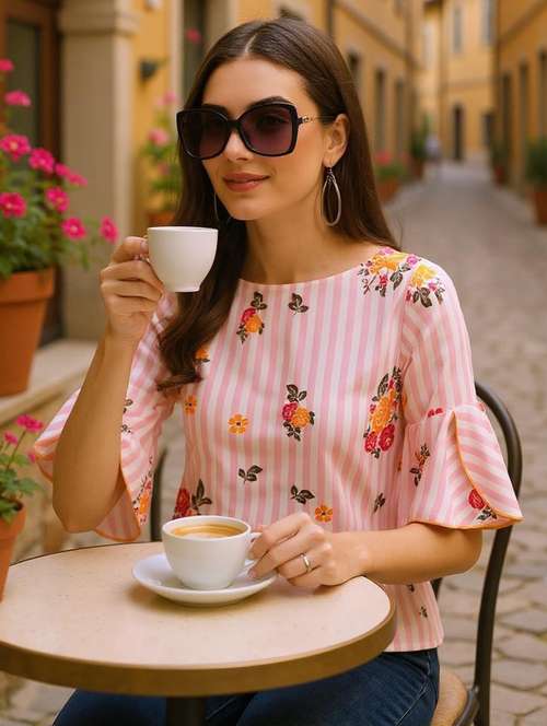 Introducing our exquisite Rayon top, designed to elevate your wardrobe with its sophisticated style and impeccable craftsmanship. Measuring 24 inches in length, this top features a charming pink stripe pattern with a delicate flower design, exuding a feminine and elegant appeal. The round neck and petal sleeves design add a touch of grace and refinement to the overall look. Made from high-quality Rayon material, this top is soft, comfortable, and durable, making it perfect for any occasion. Elevate your fashion game with this stunning Rayon top. The model's Height is 5 feet 7 inches and wears a small size