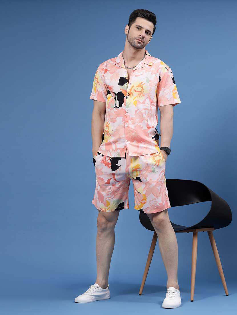 RIGO presents men's printed Co-ords made from soft textured printed Viscose Rayon fabric. The Pink Floral Print Co-ords is a versatile wardrobe essential, perfect for your outgoing look. This set features botanical print shirt and a pair of shorts, has a cuban collar, half sleeves, curved hem, and regular fit. Wear it with your favorite chunky sneakers for a stylish look and stay looking sharp and comfortable this summer in this Co-Ords set. Constructed from lightweight material, it's perfect for beach trips and hot weather. As a bonus, its loose-fitting design ensures maximum comfort all day long