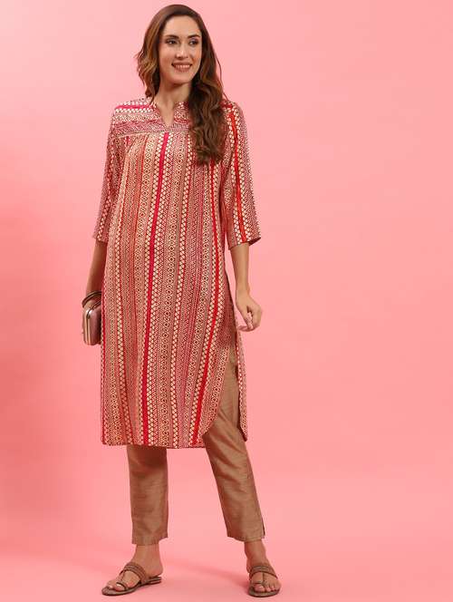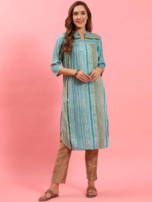 - Grab this beautiful kurta made up of rayon fabric featuring mandarin collar neck designs.