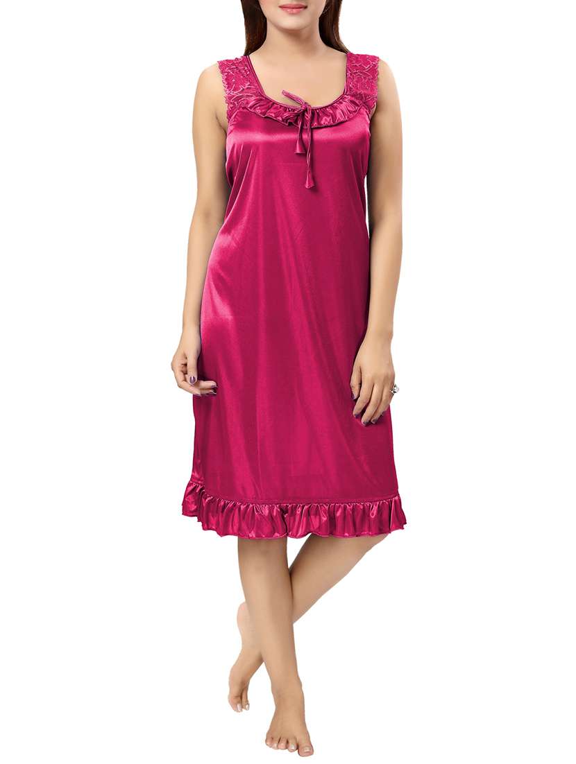 Make your night relax & stylish with this Babydoll from Be You Fashions. Made up of Satin. It has frills at bottom hem, net sleeves and round neck pattern This Nighty is the ultimate blend of comfort and style. br Length Knee (approx 35 inches) br Size-Free (adjustable fit to bust 32-36 inches) br Care Instruction: Gentle Machine wash