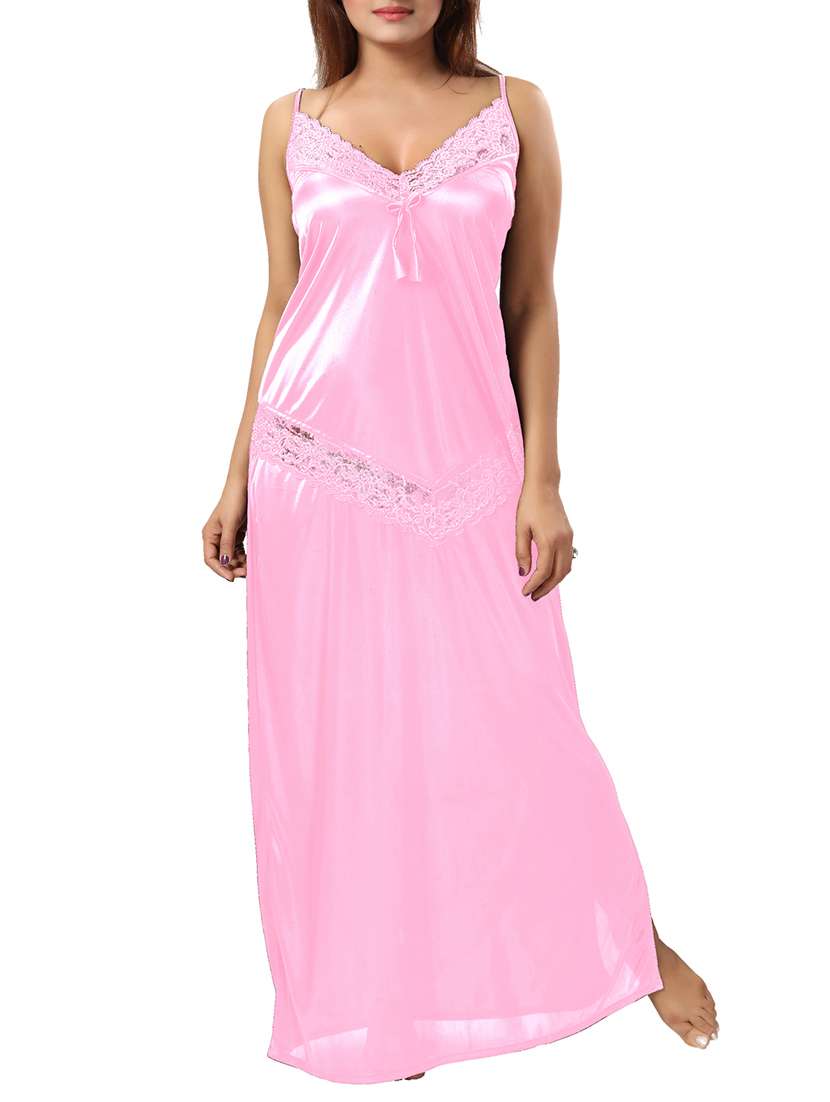 Look sexy & mesmerize with this Satin Night Dress / Nighty from Be You. It has adjustable shoulder straps, elastic details at the back for perfect fit, lace details on neck & waist. It is the ultimate blend of comfort. br Length: Full (approx-55 inches) br Size: Free (comfort fit to bust 32-36 inches)