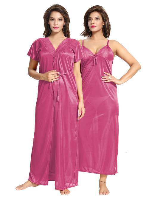 Make your night relax & stylish with this Nighty with Robe_ 2 pieces Nighty from Be You Fashions. Made up of Satin. The robe has front tie up details, nighty has adjustable shoulder straps. Size-Free (adjustable fit to bust 32-36 inches) . br Length Full (approx-55 inches) br Care Instruction: Gentle Machine wash