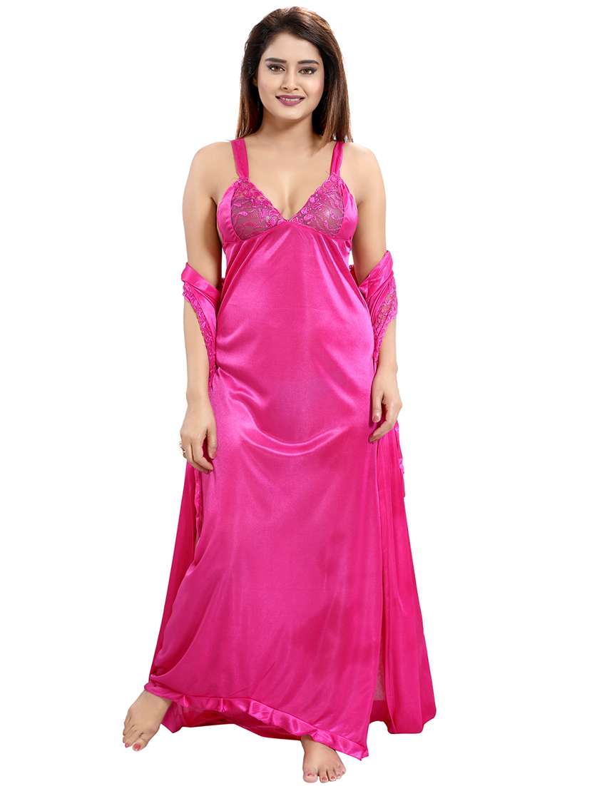 The Skirt has side tie up details.. This Nighty is the ultimate blend of comfort and style. br br Size-L(adjustable fit to bust 34-36 inches) br Lenght-Night Robe (approx 55 inches & Pajama 39 inches br Sales Package : 1 Robe, 1 Nighty, 1 Lingerie Set, 1 Top, 1 Pajama br Care Instruction: Gentle Machine & Hand wash