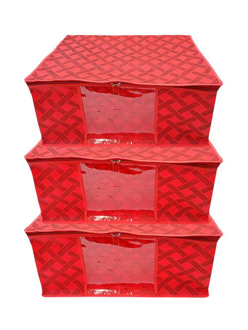 Shree Shyam Products Checks Pattern 3 Pcs Non Woven Fabric Red Saree Cover Set with Transparent Window, Extra Large