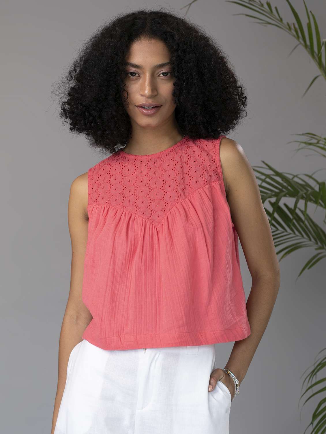 - Opt for this top made up of schiffli material and get it in a varied neck design.