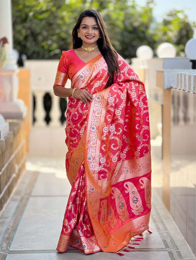 Pink Banarasi Silk Saree With Zari Weaving Meenakari Border