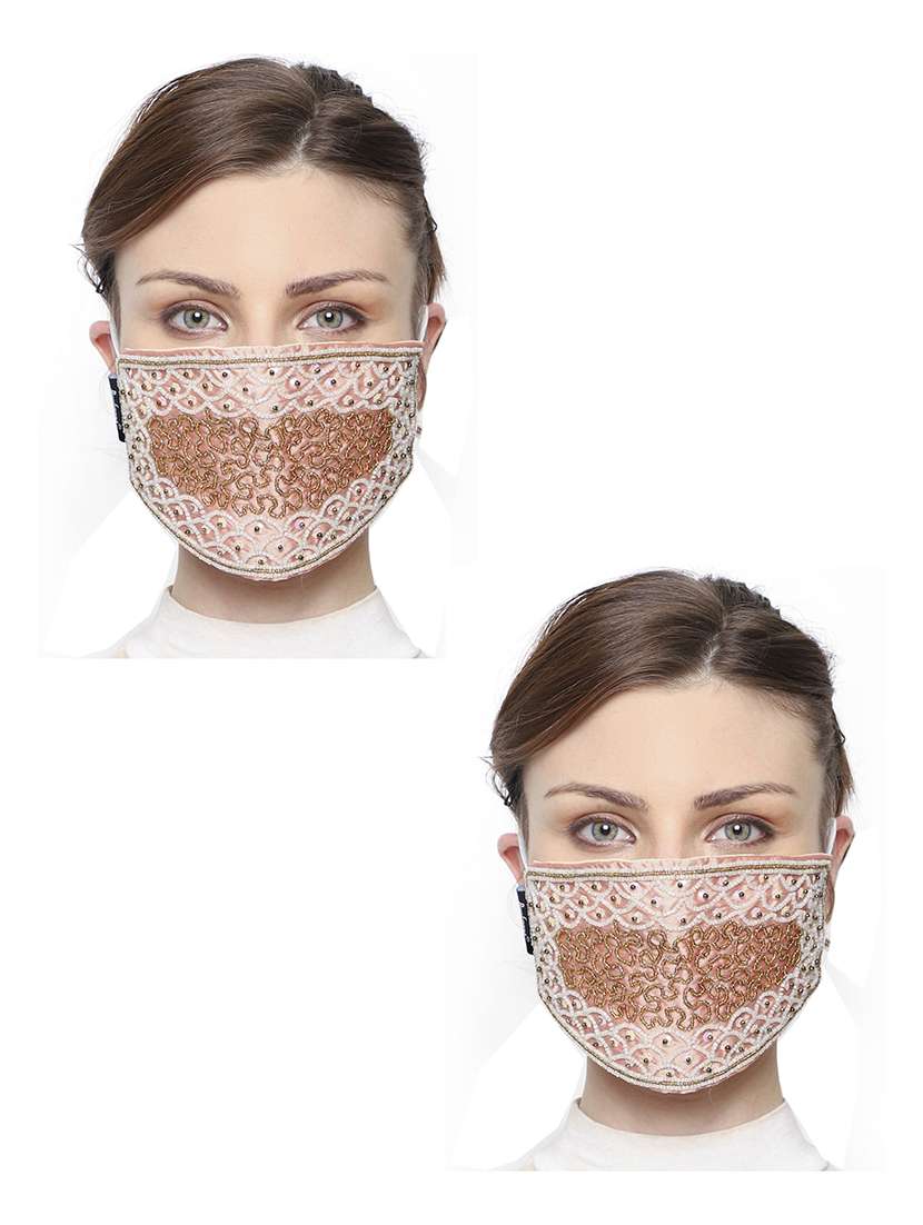 Anekaant Pack of 2 Peach, White & Gold 3-Ply Art Silk Embellished Fabric Fashion Mask