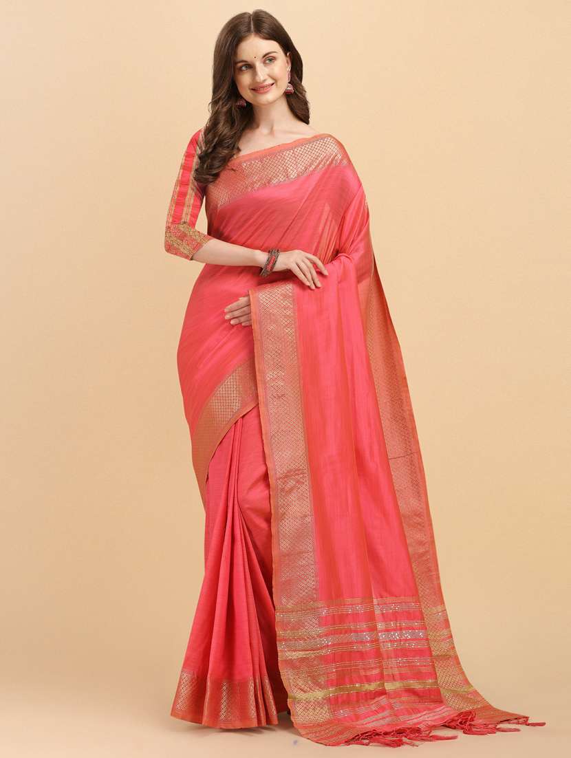 women's self design coral colored saree with blouse