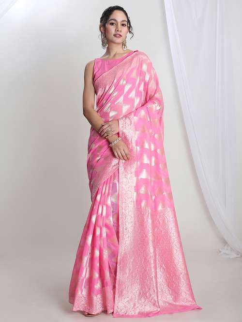 Drape yourself in elegance with this exquisite pink silk blend jacquard saree, featuring a beautifully woven geometric pattern that adds depth and sophistication. The intricate weave enhances its rich texture, while the subtle sheen lends a touch of understated glamour. Lightweight yet luxurious, this saree is perfect for festive occasions, weddings, or evening soirées. Pair it with a complementing blouse and statement jewellery to complete your graceful look.