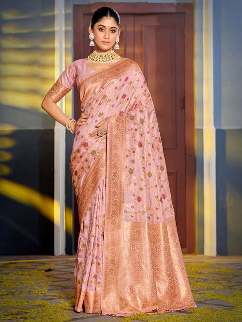 Drape yourself in timeless heritage with this Pink Banarasi silk saree, featuring intricate floral jaal work and a rich golden zari border. A symbol of royalty and tradition, perfect for weddings, festivities, and celebrations.