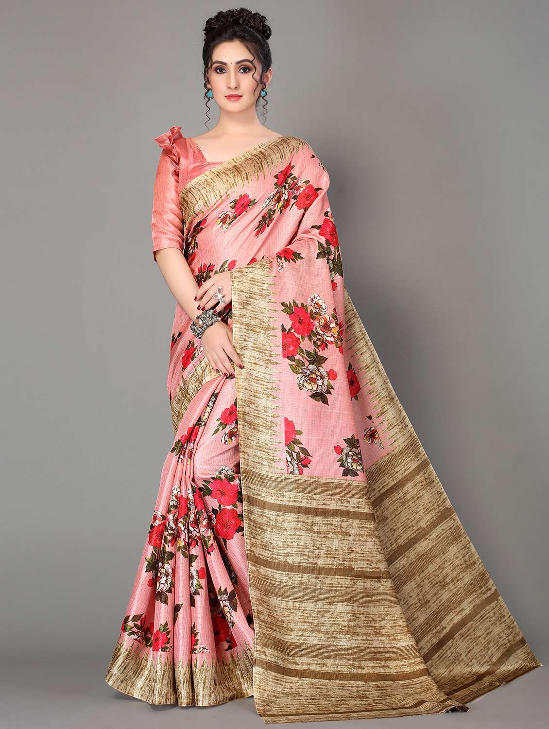 - » women's floral coral colored saree with blouse