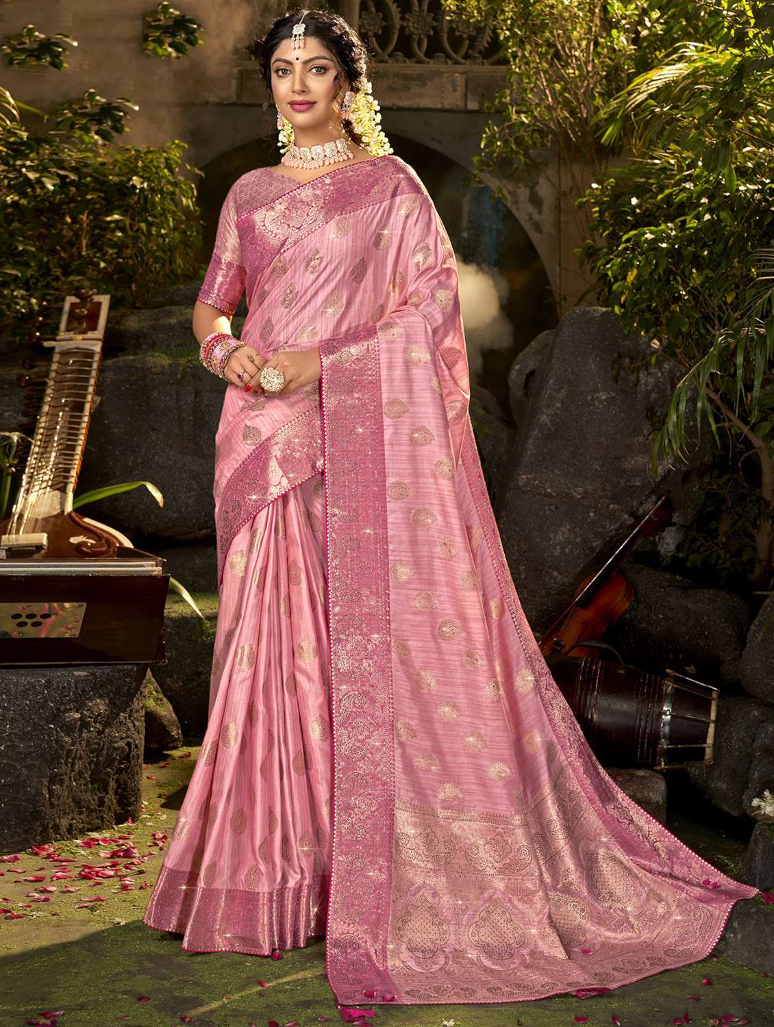 golden zari work woven saree with blouse