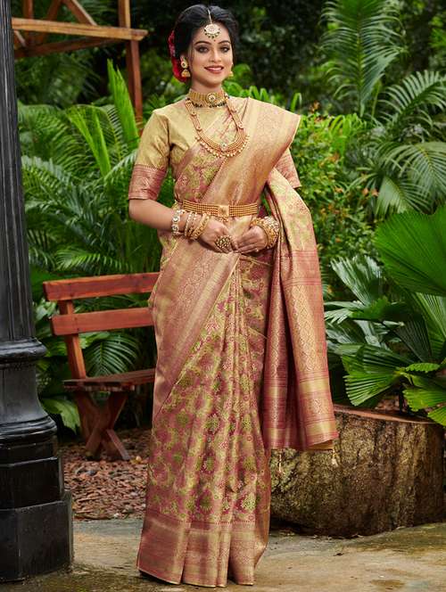women's self design gold colored saree with blouse