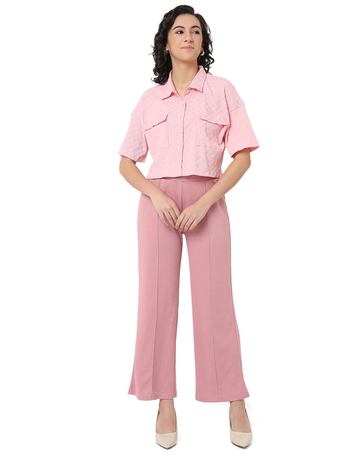 Radiate confidence and grace in this Sophisticated pink co-ord set, showcasing a boxy crop shirt teamed with high-waisted trousers.Flattering fit with delicate feminine details, it’s the perfect blend of style and comfort for both casual days and workwear.