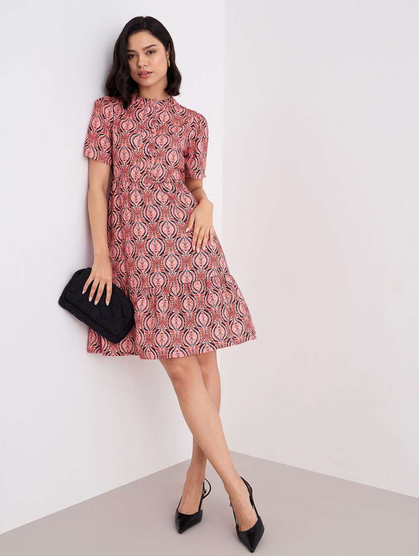 Refresh your everyday look with this Pink Geometric Printed A-Line Knee Length Dress from Styli. Made from lightweight woven polyester, this dress features a sleek Mandarin collar, short regular sleeves, and a flattering A-line silhouette. The modern geometric print adds a stylish edge, making it a perfect choice for casual outings, workdays, or relaxed weekends. Designed for comfort and versatility, it finishes at the knee and is machine washable for effortless care.