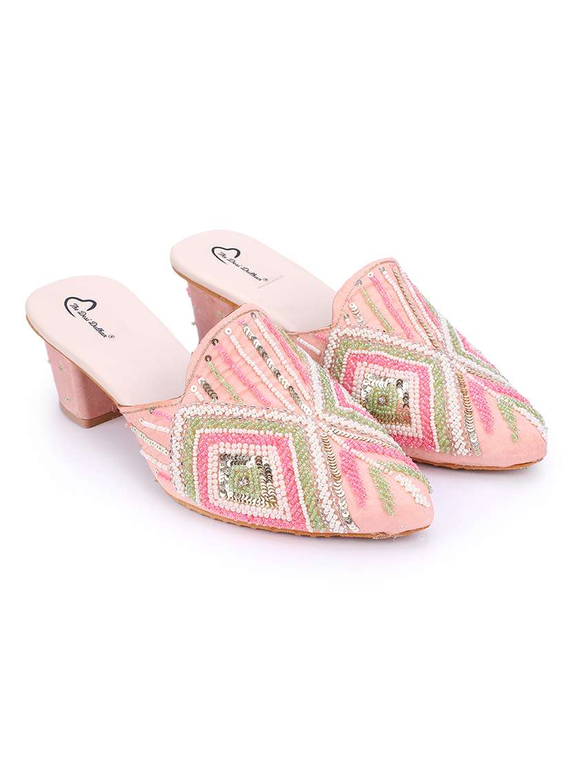 A pair of PinkMulti embellished handcrafted mules, has regular styling and open back detail synthetic embellished upper cushioned footbed Textured and patterend outsole, has a block heel
