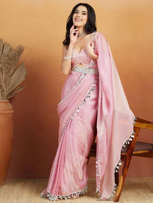 Delicate and elegant, this pink glass chiffon saree features shimmering mirror work and a beautiful lace border. Lightweight and flowy, it’s perfect for weddings and festive occasions.