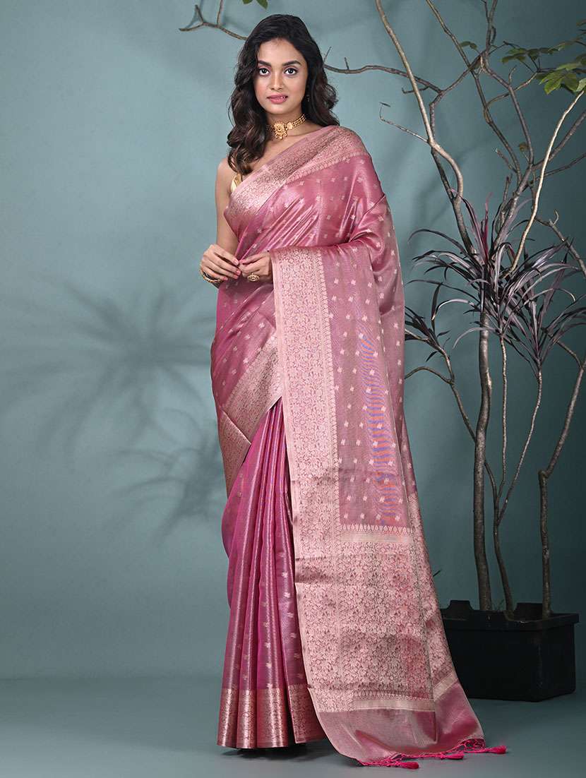 This graceful pink tissue saree combines timeless elegance with modern charm. Crafted from luxurious tissue fabric, it features delicate shimmering patterns and an intricately designed border that enhances its beauty. Perfect for formal occasions, weddings, or festive events, this saree offers a sophisticated and refined look. Paired with a matching blouse, it is sure to make a statement at any celebration.