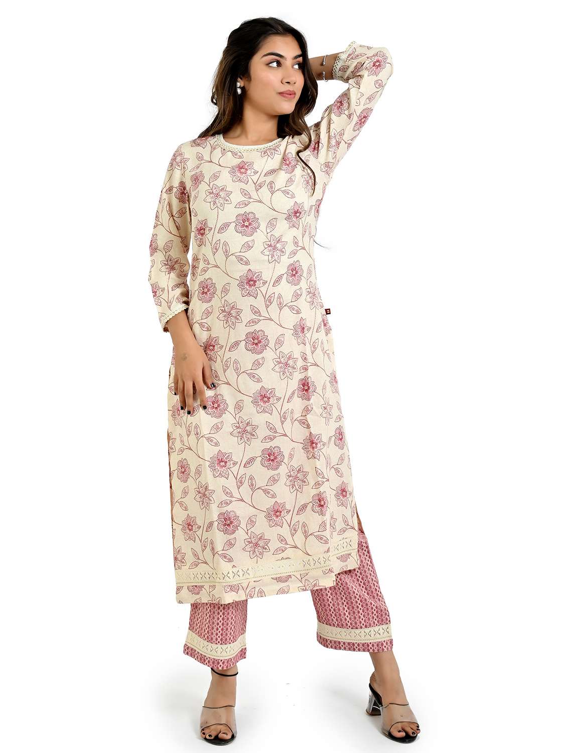 - Grab this beautiful kurta made up of cotton blend fabric featuring round neck designs.