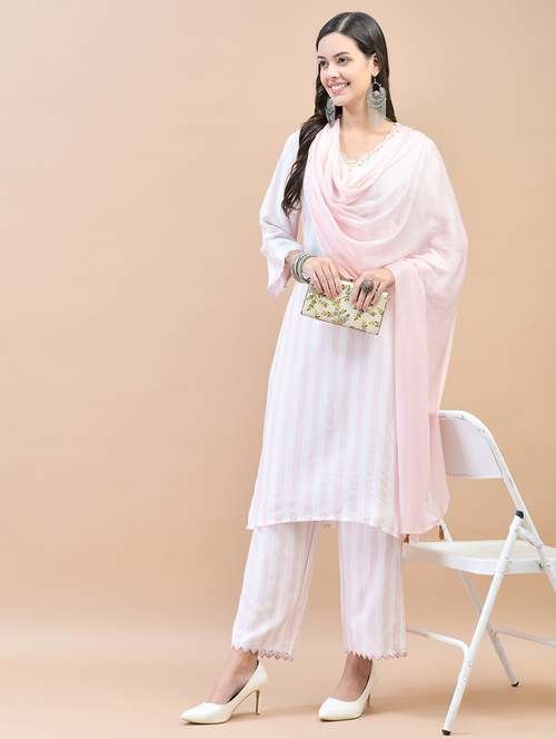 - Find gorgeous sets of ethnic wears in trending designs in white colors suitable for casual wear of occasions.