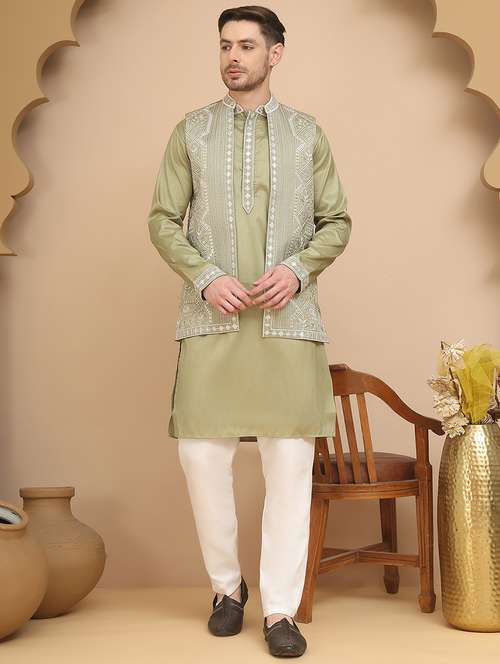 men mandarin neck kurta pyjama with jacket ethnic wear set - 21944462 - Very Small Image - 1