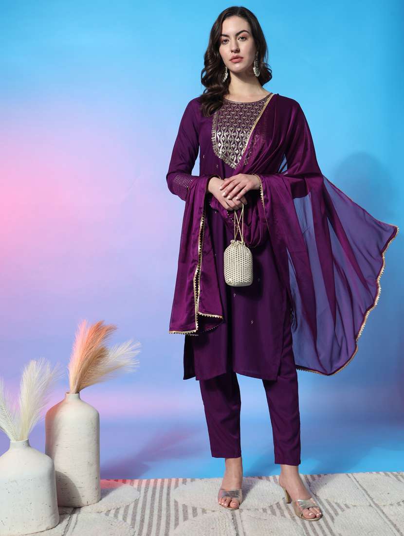 - Find gorgeous sets of ethnic wears in trending designs in purple colors suitable for festive wear of occasions.