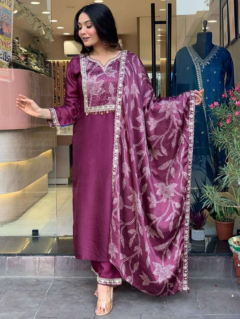 - Find gorgeous sets of ethnic wears in trending designs in purple colors suitable for festive wear of occasions.