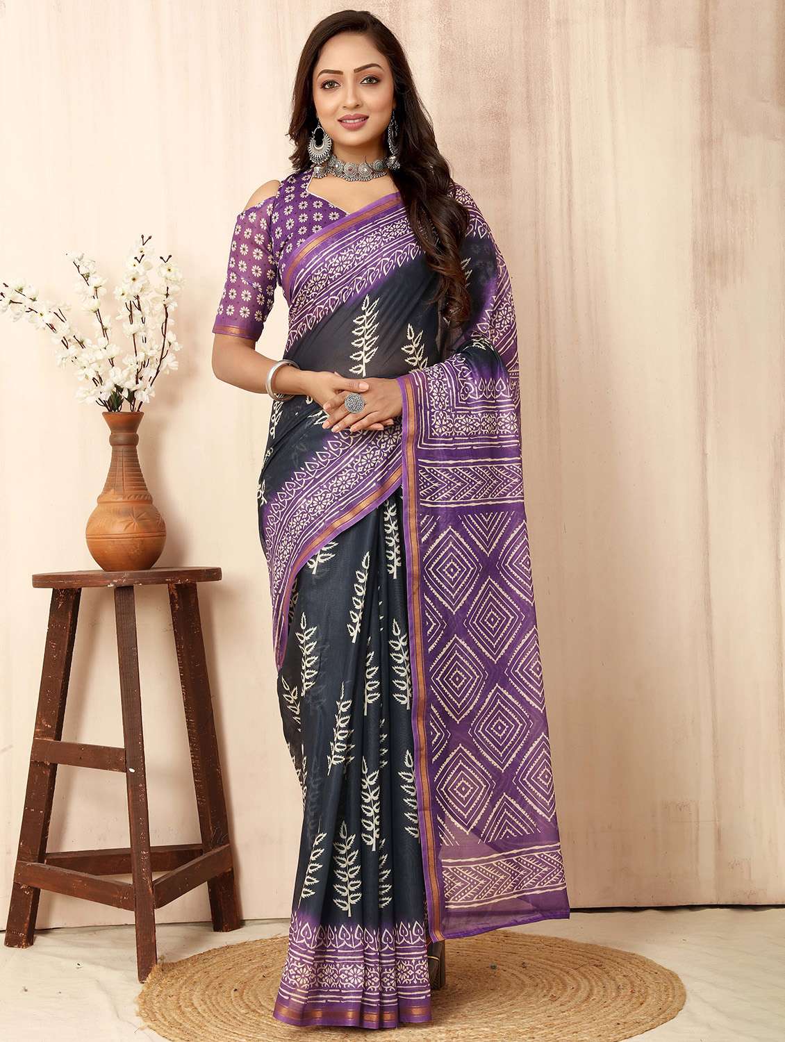 purple printed saree with blouse