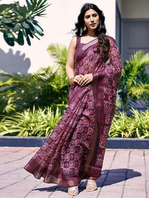 women purple batik printed saree