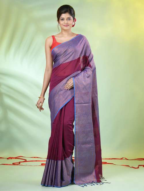 Indulge in sophisticated comfort with Purple Cotton Blend Saree With Zari Borders, a fusion of softness and elegance. Combine it with a stylish blouse for a modern touch or enhance it with statement jewelry for a touch of glamour.