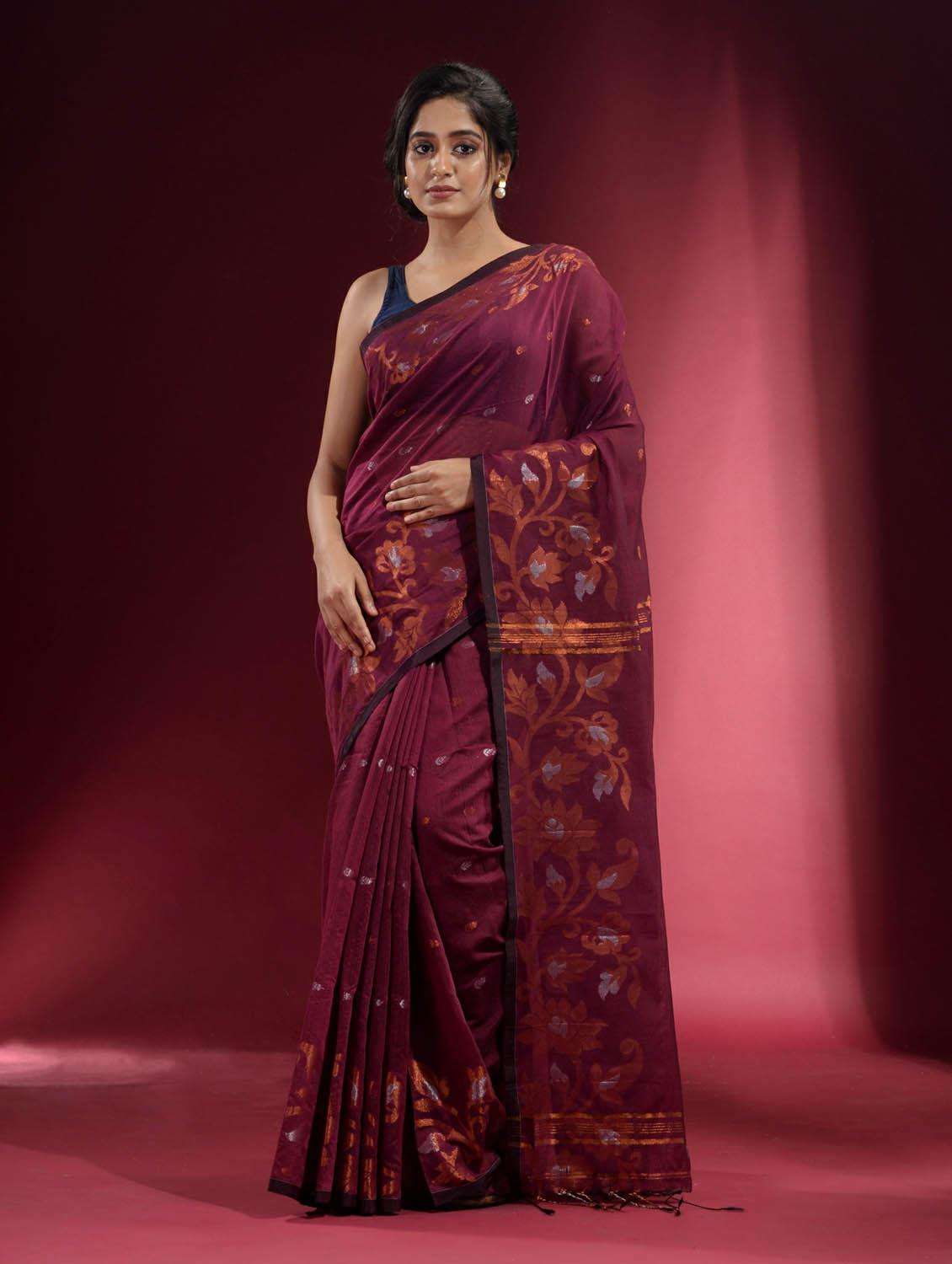 Look alluring in this plum purple blended cotton handwoven saree. It has small ethnic motifs woven all over. The borders have woven floral designs in silver and antique gold zari. Stripes are woven in the pallu for a highlighted look.