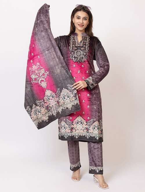 women printed long sleeve kurta pant with dupatta set